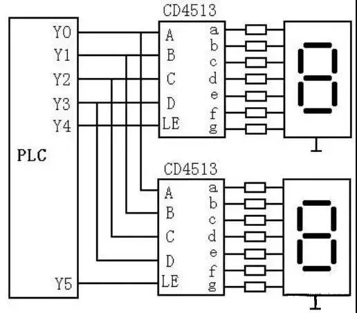 如上圖所示電路中,采用具有鎖存、譯碼、驅動功能的芯片CD4513驅動共陰極LED七段顯示器,兩只CD4513的數據輸入端A~D共用PLC的4個輸出瑞,其中A為最低位,D為最高位。LE是鎖存使能輸入端,在LE信號的上升沿將數據輸入端輸入的BCD數鎖存在片內的寄存器中,并將該數譯碼后顯示出來。如果輸入的不是十進制數,顯示器熄滅。